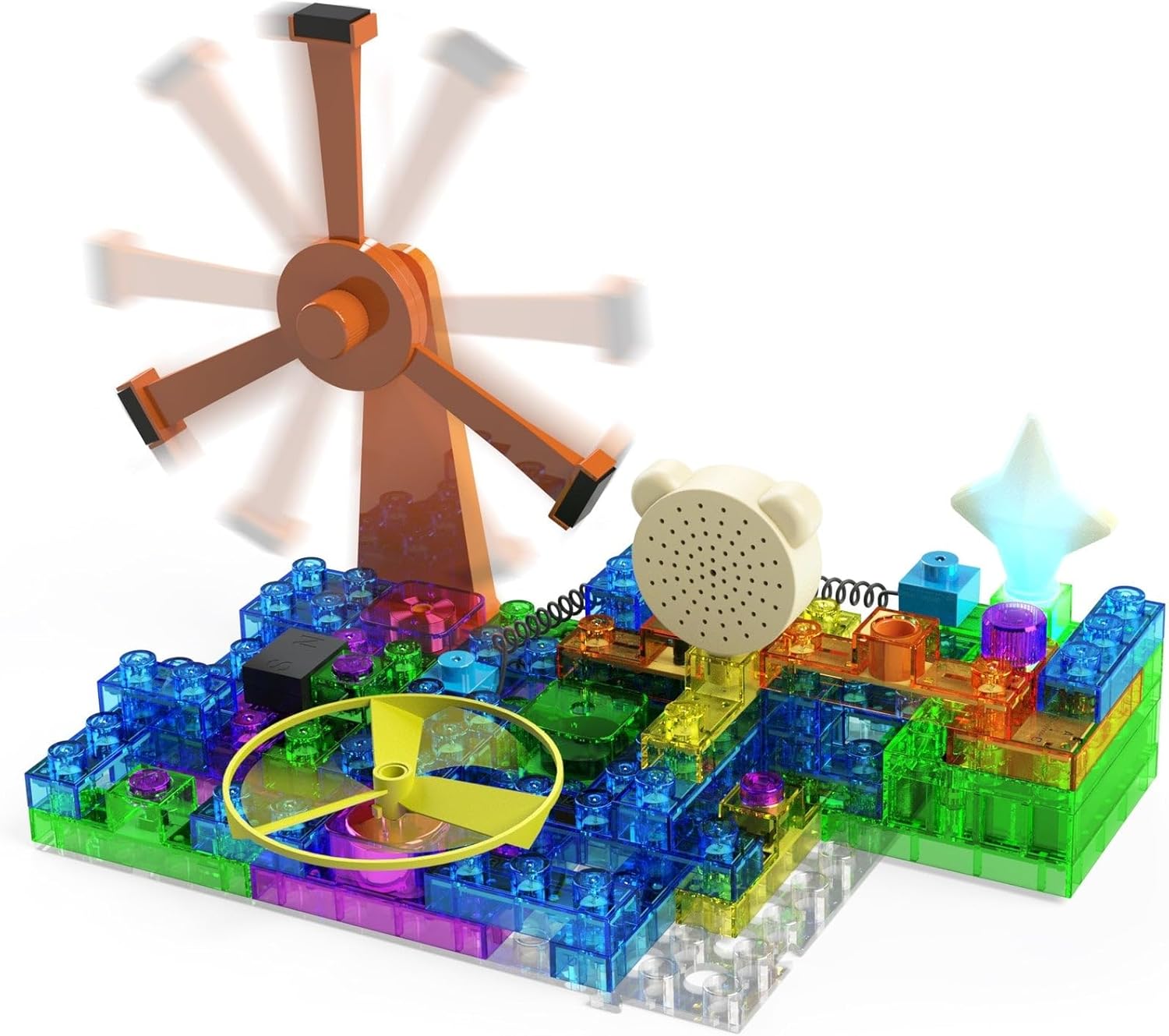 This kit provides hours of fun and educational play for kids 8 and up. The colorful building blocks have electronic components in them that, when assembled properly, will make circuits that light different lights, create entertaining sounds, and spin a motor and fan. You can even build an electromagnetic inductive windmill that spins continuously!