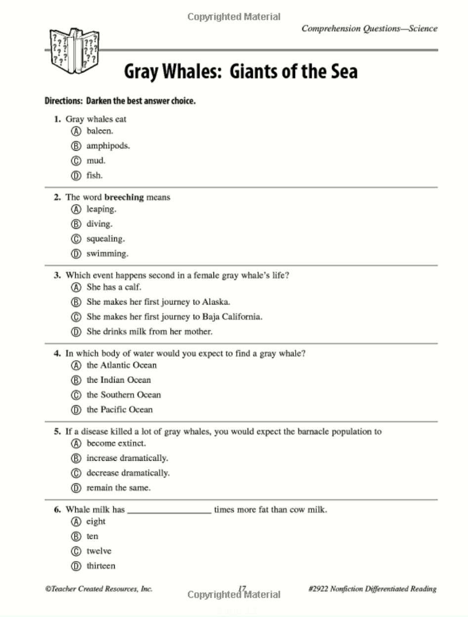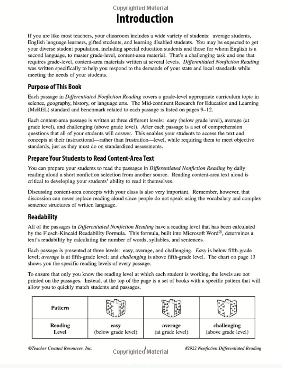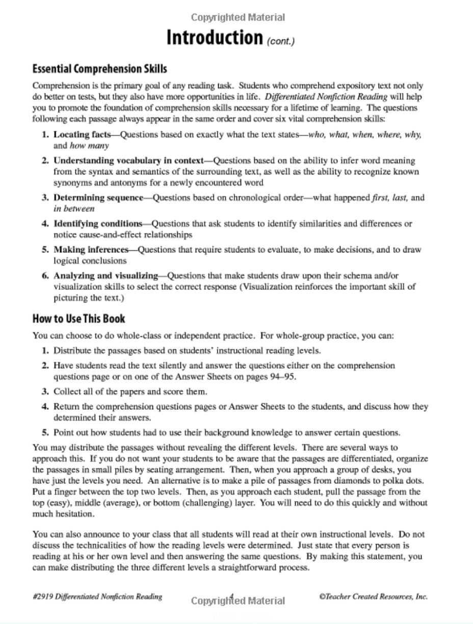 This book allows you to teach the same grade-level content to students with varying reading abilities while keeping the look of the assignment the same. Students cannot tell who was getting what reading level, or that they are different at all. The same information is written at three different levels: below grade level, at grade level, and above grade level. All the students are able to read the passage and have the information necessary to respond to the same six questions that evaluate their comprehension of the subject matter. This book was amazing!