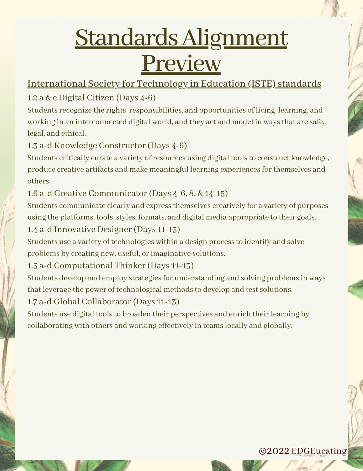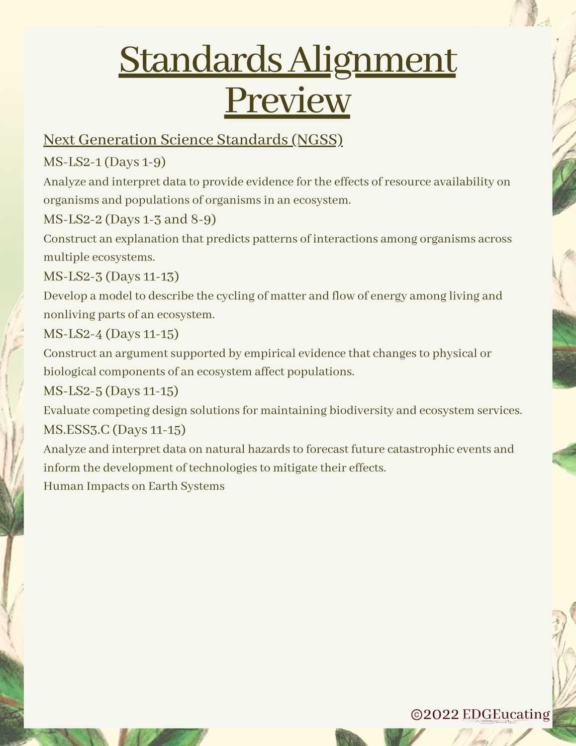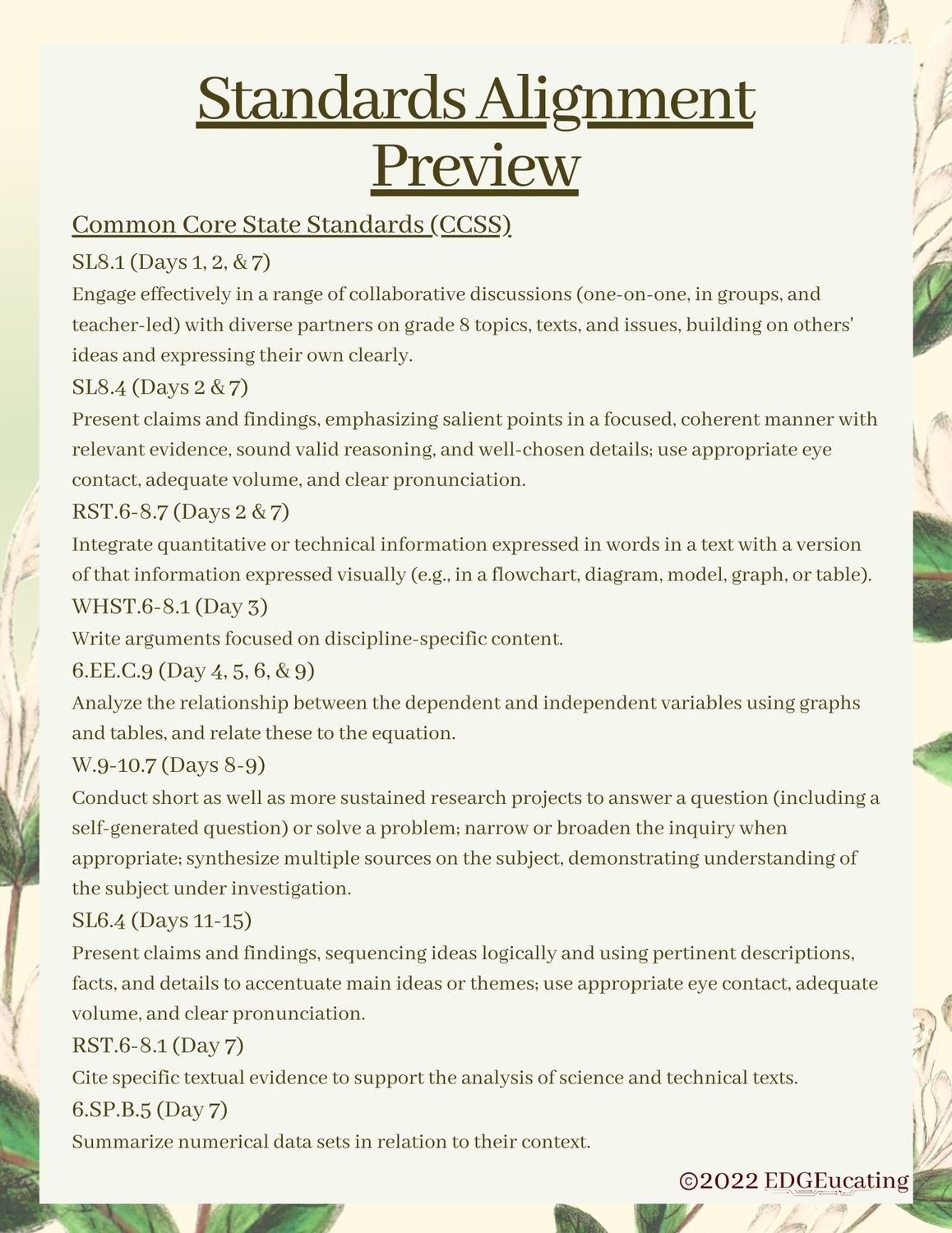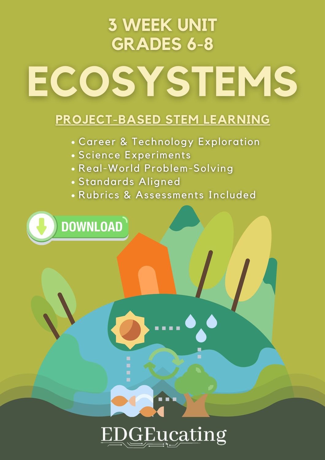 Science addresses questions about the natural and material world. In this unit, we will be exploring these connections in more depth. We will examine how forces interact with and disrupt nature. This unit includes a 15-day plan, a checkpoint, activities, labs, and rubrics. In addition to the CCSS & NGSS standards listed, it covers ISTE standards: 1.2.a, 1.2.c, 1.3.a-d, 1.4.a-d, 1.5.a-d, 1.6.b-d, 1.7.a-d. This is a very thorough unit on Ecosystems and the use of technology to collect data. As a culminating activity, the students will research and explore careers related to government agencies, environmental science, and unmanned aerial vehicles (drones).