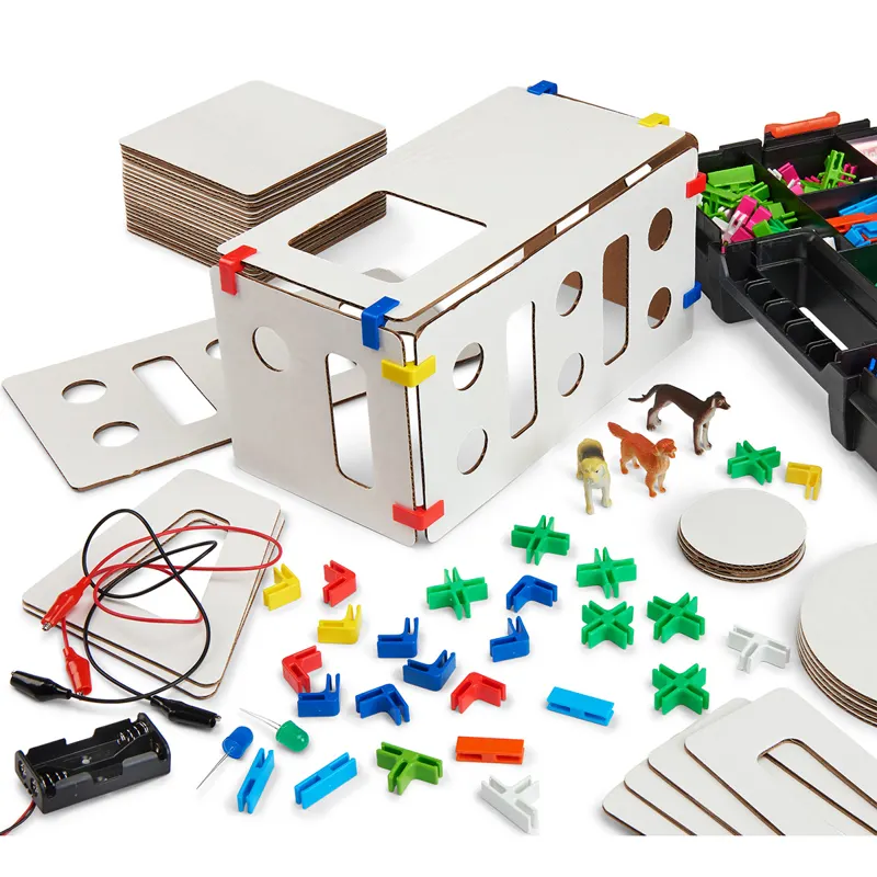 3Dux Power House LED Kit gives students the ability to light up their Iconic Home Architecture Set with the LED lighting add-on feature. Follow the instruction sheet to help your young designers learn about electricity and circuits while they imagine, design, decorate and light up their homes. This kit includes all cardboard pieces, connectors, crayons, and LED lighting components necessary to create the proposed architectural design along with extra components to let your imagination take over.