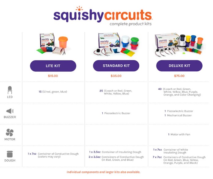 The Lite Kit is best complemented by the Standard or Deluxe Kits, as they offer additional components for expanded experimentation. Components from larger kits can be shared, enhancing the learning experience. The inclusion of a battery holder in each Squishy Circuit means that this Lite Kit can easily amplify the fun when paired with other kits.